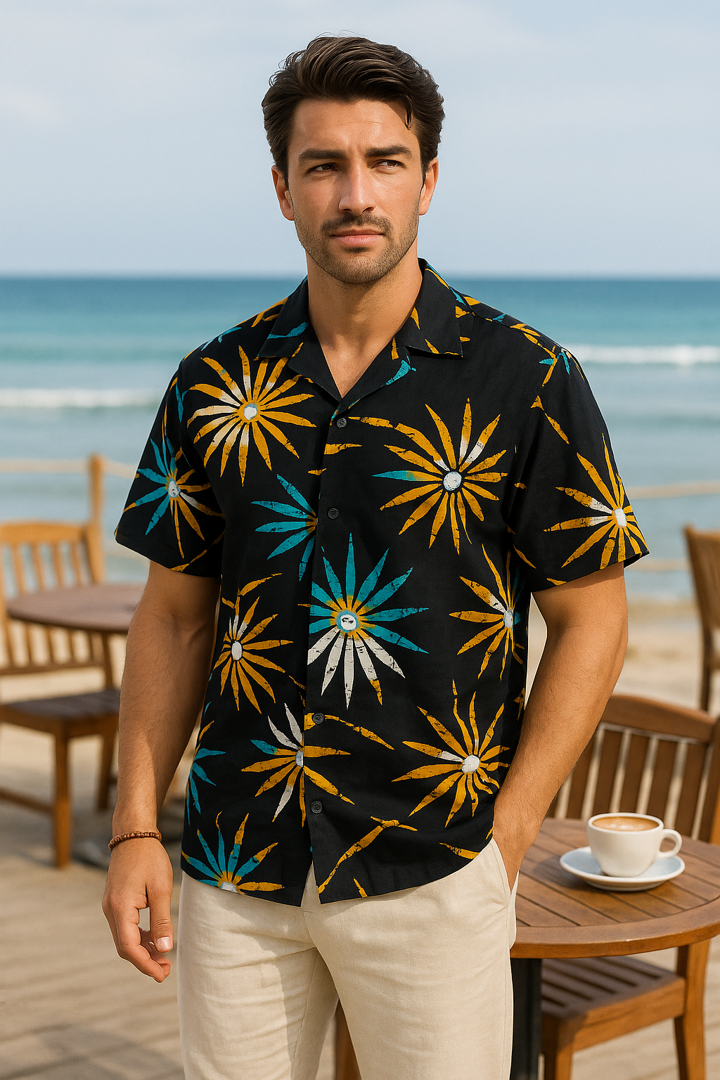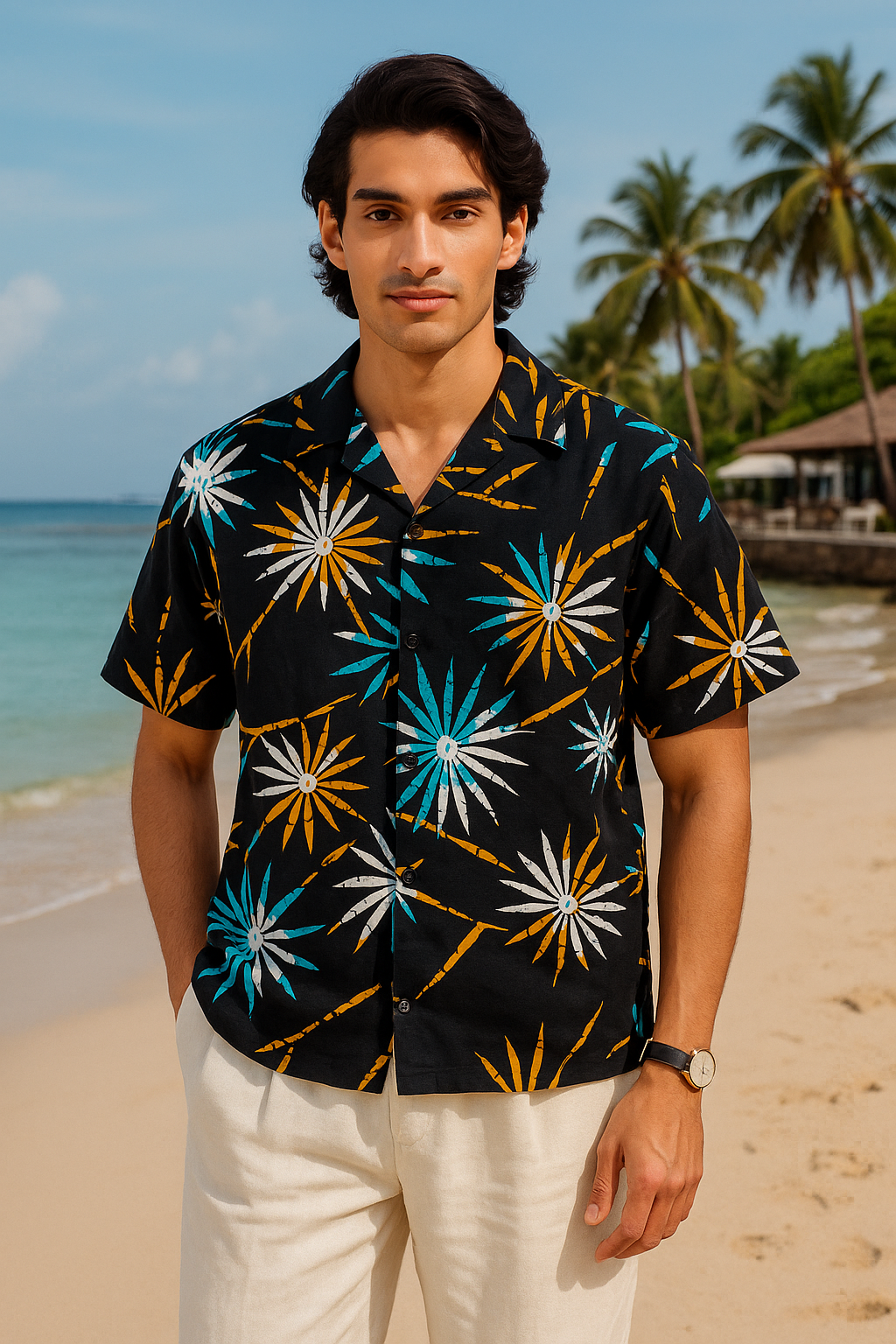 Ariza Black Tropical Floral Premium Linen Cuban Collar Shirt