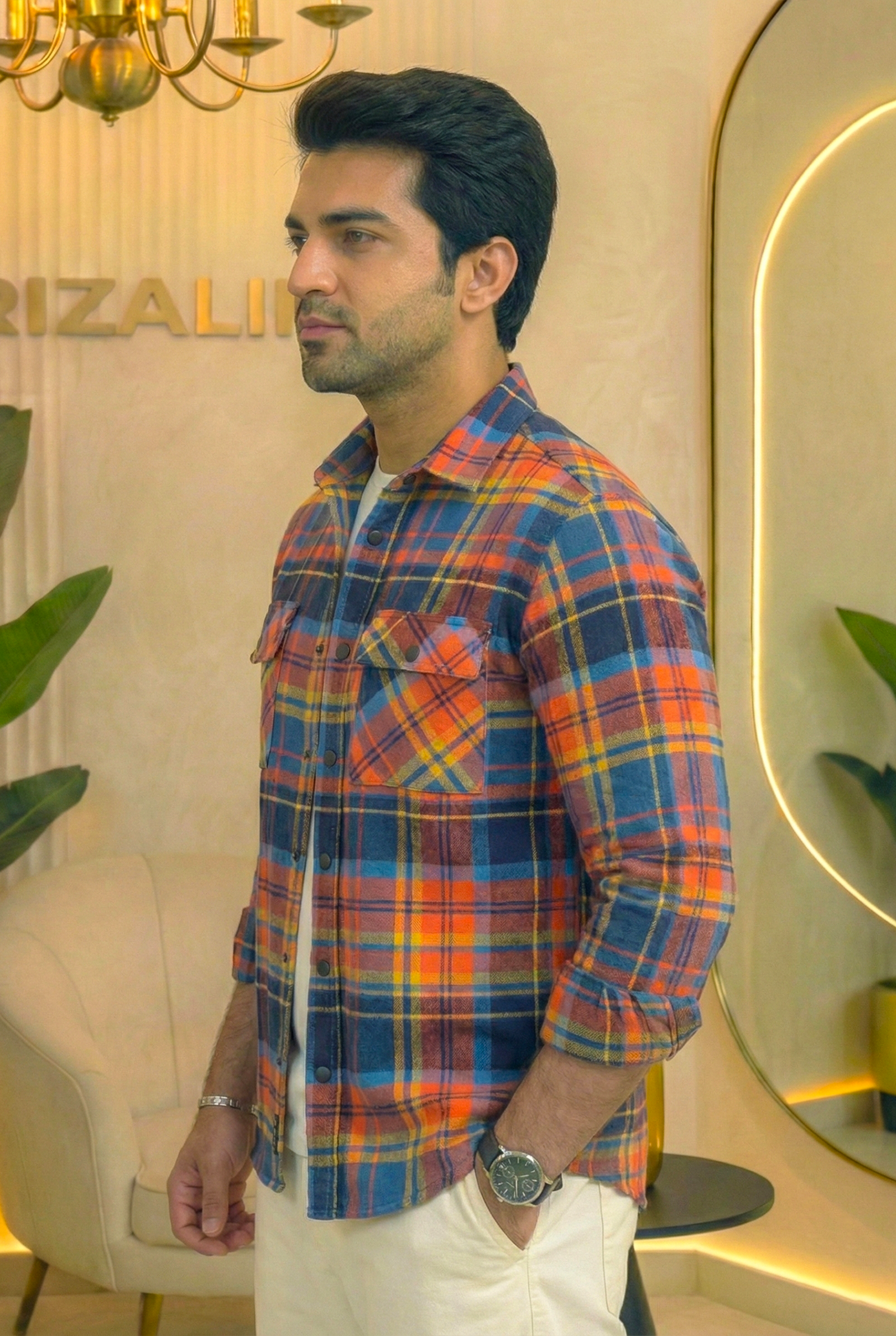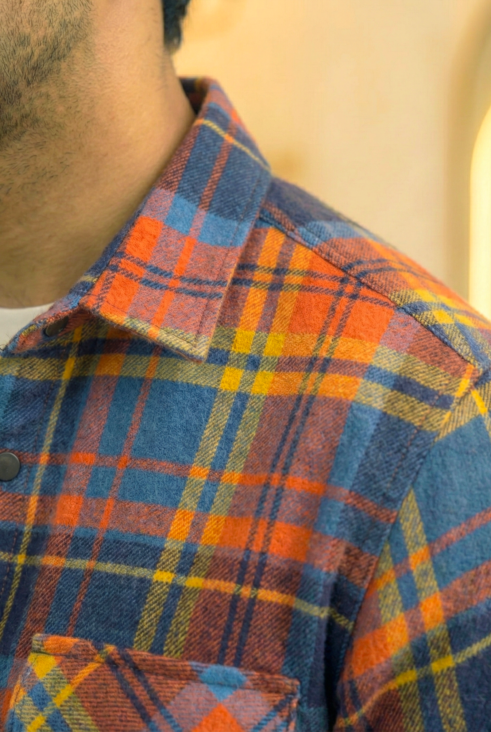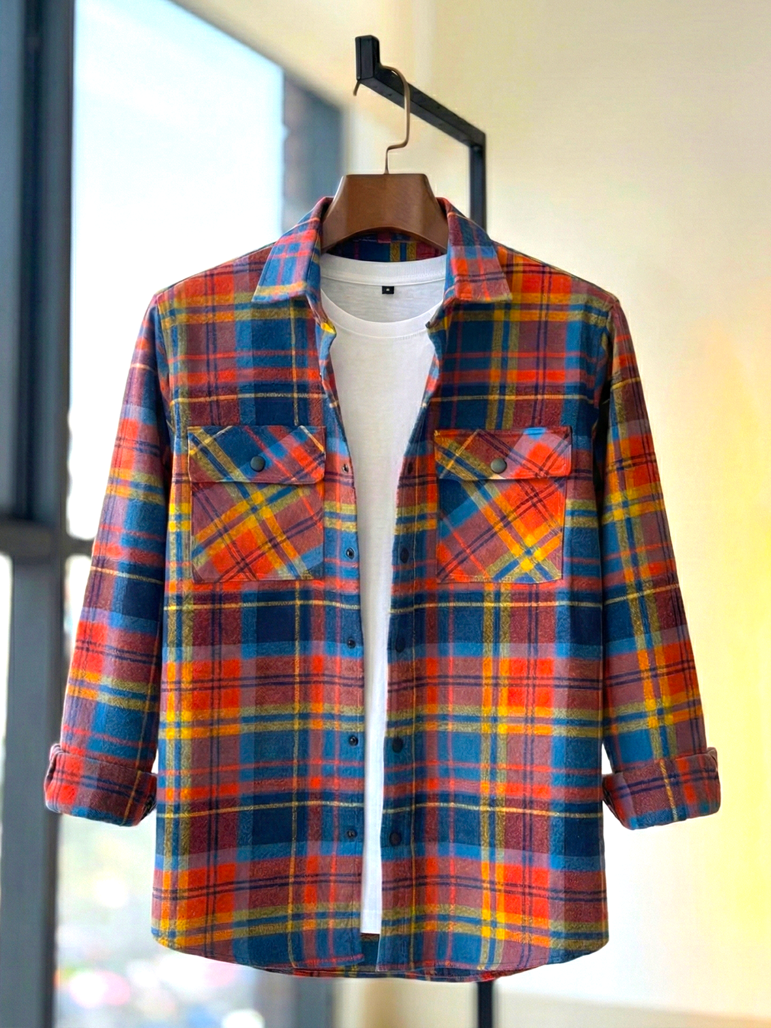 The Ariza Premium Rust Check Flannel Shirt is designed for men who want a warm, stylish, and well-structured winter outfit. Featuring a rich Rust Orange & Navy Blue Check pattern, this premium flannel shacket perfectly balances the comfort of a soft shirt with the warmth of a winter jacket. With its clean tailored fit, durable stitching, and smooth inner feel, it’s ideal for office wear, outings, university style, and everyday winter use.